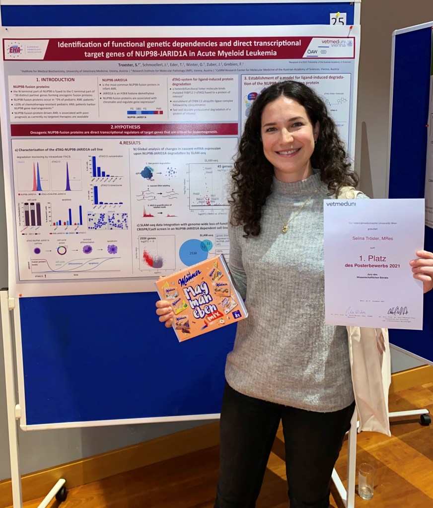 02.06.2020: Congratulations to our motivated and brilliant PhD fellow, Selina Tröster, for being awarded a competitive DOC PhD Fellowship by the ÖAW to establish a novel protein degradation model to study NUP98-fusion proteins in AML!