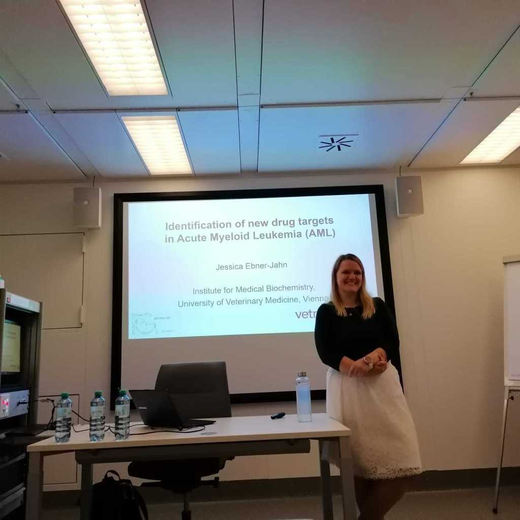 26.09.2023: This tuesday, Jessi successfully defended her PhD thesis “Identification of new drug targets in Acute Myeloid Leukemia”. She did an excellent job in presenting her work and answering the many questions from the committee! Afterwards we had some drinks and a nice flade at the Fladerei in Berggasse. Congratulations, Jessica Ebner-Jahn!