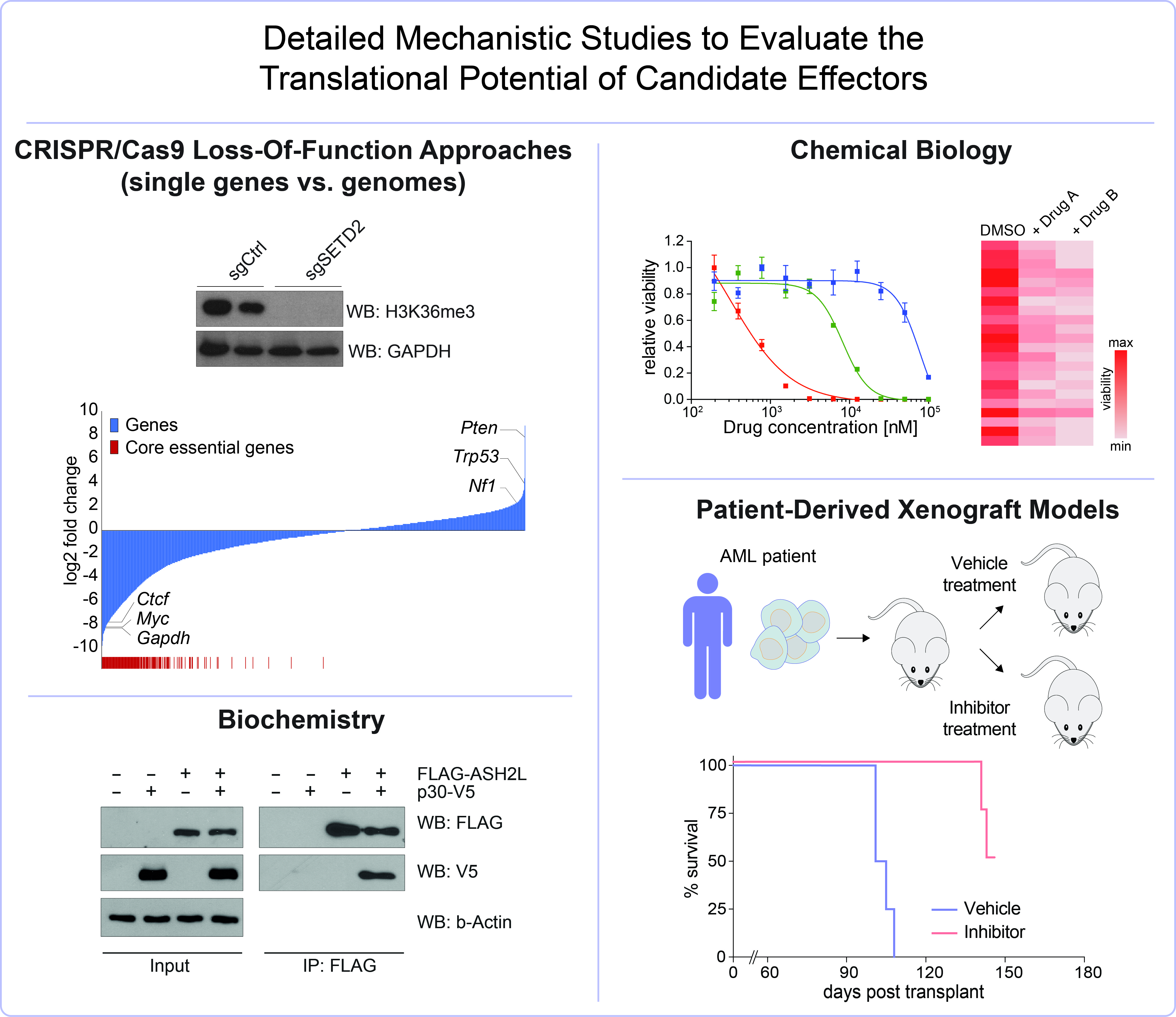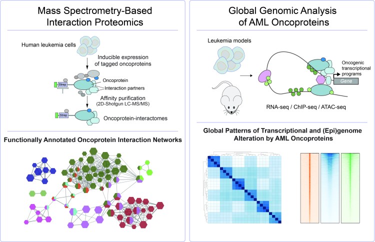 We have developed a number of biochemical approaches for global proteomic characterization of AML models by Mass Spectrometry. In parallel, we use NGS-based methods to investigate global effects of AML oncoproteins on transcriptomes and epigenomes. Genome-scale CRISPR/Cas9-mediated Loss-of function screens are used to functionally explore AML genomes.