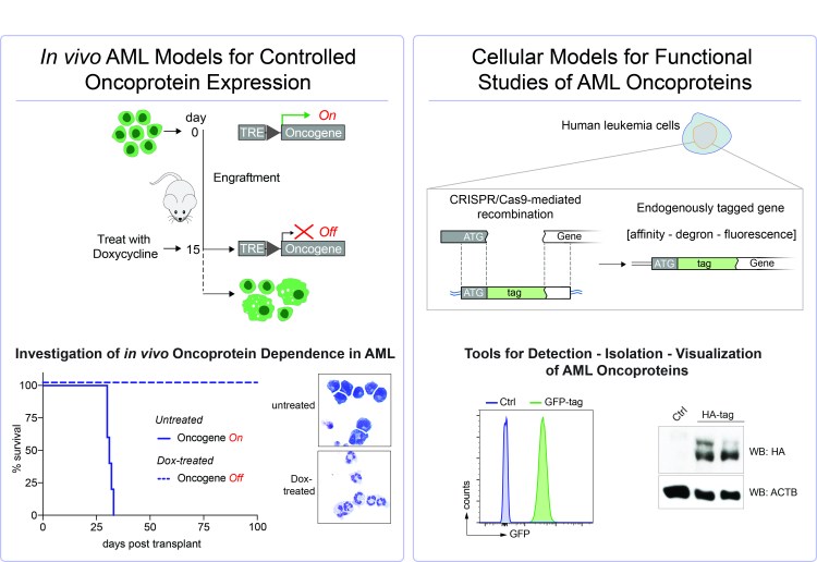 We have built a comprehensive battery of tools to model and perturb oncoprotein-driven AML in cell culture and in vivo. This includes tools for inducible gene expression, modification of endogenous genes and gene silencing using RNA interference as well as CRISPR/Cas9-mediated applications.